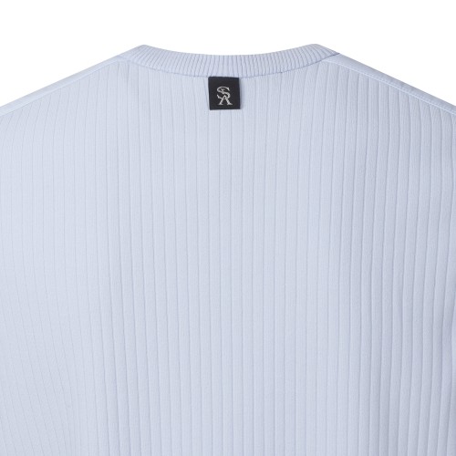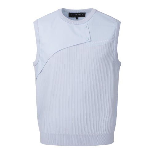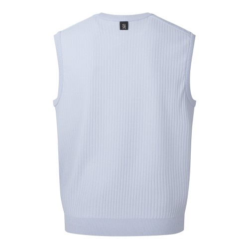 ◇ DESCRIPTION - 우븐 덧방 라운드 니트 베스트. - 앞,등판 골조직 소재. - 로고 후막 프린트 포인트.